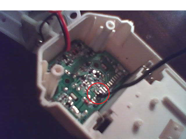The next step was to rip it apart and find the pins for the push button that triggered it to spray. The pin needed is labeled R18 or R29 something like that. (Figure 1-2)