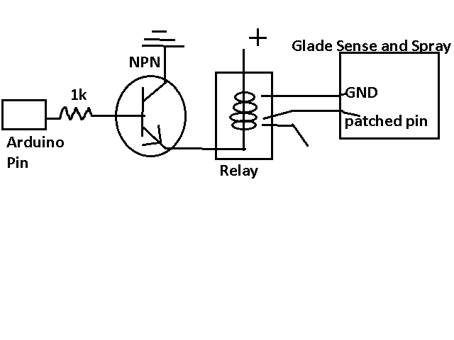 Next build a circuit to read an arduino pin and trigger it to spray. I used a relay to “close” the circuit/ act as the push button for the Glade’s circuit board. The relay is powered with a NPN transistor that was suposed to read the HIGH value from the arduino, but the value wasn’t a high enough voltage to trigger the NPN; I used an Op Amp to increase the voltage from the arduino to trigger the NPN to power the relay to turn the Glade…Spray on. Wow, that was a mouth full… It is a simple circuit.
