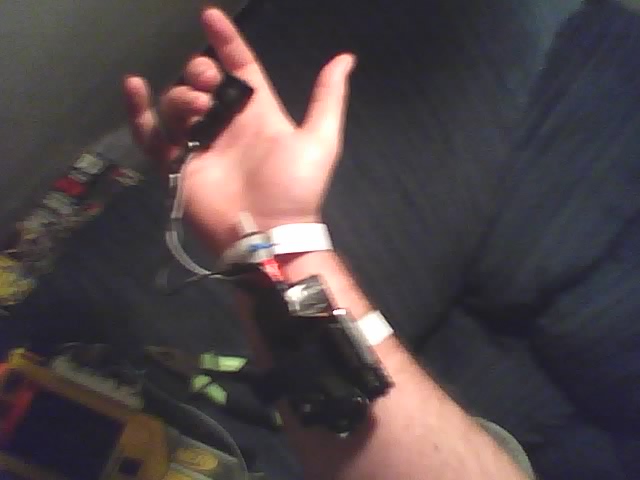 I stopped at Kmart to see if they have any… not in stock yet. Since the next store that would have them is too far away to make a trip this week, I went to a dollar store and bought some Velcro. This is a prototype and I plan on making a better one. I’d like to trigger the “fire” with a flex sensor, and a digital display of how many volts are on the cap. I also plan to use at least three caps on the next build; along with a bigger power supply.