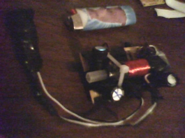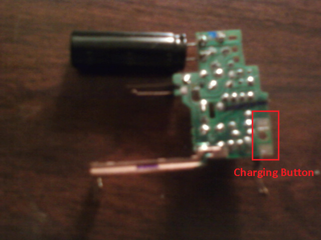 The circuit found in the camera needed a little modding. I took the flash bulb off, along with the copper contacts. The button used to initiate the charge was not a push button; rather two pads… I point it out in the picture below. Anyway, I soldered two wire to them, and put it on a switch.