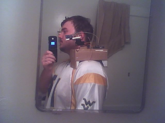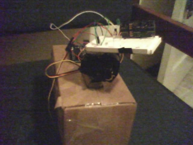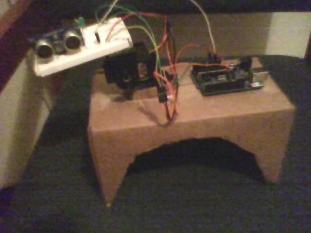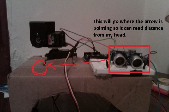 Here are some pictures of the first setup. I plan to make changes.The range finder you see will judge the distance from my face, if I turn my head and it goes too far away, the servo will move in the direction I moved my head to get back in its original position; hence, it will follow my head looking where I look. Tilted head position will be judged from an accelerometer and mapped to the servos as well.